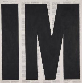 Incorporating nearly 40 pages from Ralph Ellison’s 1952 novel, Invisible Man, Rollins, and his collaborators painted IM over the pages in bold black block lettering. Invisible Man is a story about the world’s inability to recognize a Black man’s humanity because of his Blackness. Viewers can make out fragments of this pioneering textat the edges and in between the two prominently painted letters. Ellison’s prologue (the word is visible in the top left corner of the work) begins with: