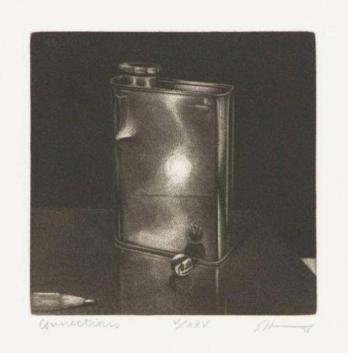 Exhibition History"Passion on Paper: Masterly Prints from the KIA Collection," March 17 - July 15, 2018, Groos Gallery.Label Text"Ecker presents countless clever visual pleasures in this miniature masterpiece. He plays the glass marble against the reflective qualities of the tabletop and the metal canister. His ability to convey the splashes of light on the many indentations of the canister is a tour-de-force in itself, but he also has fun portraying space. We read depth by the placement of the pencil in the foreground and the little triangle of light along the right edge of the image suggesting a receding floor-line.