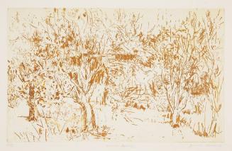 Label Textfrom KIA Traveling Exhibition text: Jeanne Richards is a young American printmaker specializing in landscapes. This is one of her etchings that has been printed in a colored ink instead of the traditional black ink to give an unusual look. Note how the print resembles a pen and ink drawing.There are no works to discover for this record.