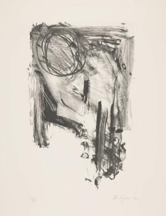 Hartigan had not made lithographs before she delved into this project. We can view this print as a journey of experimentation and discovery. The variety of marks we see are evidence of the artist using every tool at her disposal to draw, brush, and scrape a full range of effects onto her stone. The subject is inspired by a poem, The Hero Leaves His Ship, authored by her friend, Barbara Guest. Hartigan produced four lithographs for this project. This is the second print of the series (written by Nancy Sojka for Passion on Paper: Masterly Prints from the KIA Collection, 2018)."