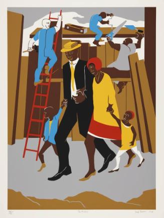 "Resilience: African American Artists as Agents of Change," [Travel Version] at the Dennos Museum Center, Traverse City, MI (June 6, 2021 - August, 15, 2021)Label TextJacob Lawrence’s cunning use of scale and color draws the viewer into this eye-catching scene. The family fills the foreground, and Lawrence frames them between the oblique lines of the red ladder and the wooden planks. The shallow space created by the builders' wall further enhances the family’s importance. The muted background colors focus our eyes on the man's black suit and yellow tie, the red hats of the mother and daughter, and the builders' blue coveralls. The overall tone of the work is positive and hopeful.