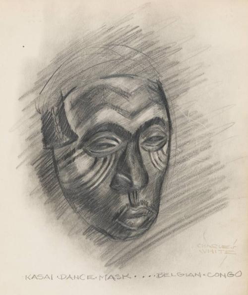 "American Realism: Visions of America 1900-1950," Muskegon Museum of Art (May 11 - August 27, 2023); Flint Institute of Arts (September 9 - December 30, 2023); KIA (January 21 - April 14, 2024).Label Text"Charles White’s images depict African Americans with determination and grace. Kasai Dance Mask comes from one of White’s sketchbooks during his studies at the Art Institute of Chicago. This image bears markings similar to masks made by the Kuba people in the southern Democratic Republic of the Congo. The Kuba have some of the most elaborate masks and masquerading traditions that honor the ngesh (nature spirits). The ngesh are thought to be similar to humans, live near water, and can appear at any moment. The Kuba believe that ngesh influence happenings within the community, such as periods of harvest and women’s fertility. While White drew geometric patterning above the brow and on the face; a line of dangling cowrie shells on the temple; almond-shaped eyes, the identity of the mask is unknown. It is perhaps a ngady mwaash, a highly decorated mask used to honor Kuba women.