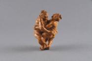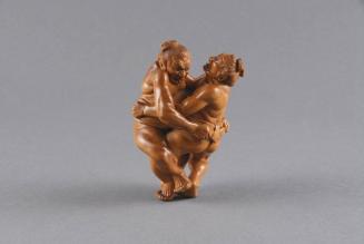 Label TextSeihosai Meikei is among the greatest netsuke and okimono carvers of any era. He usually works in wood to depict scenes of high drama and action, often from lesser-known legends and literature. In one wrestler’s face, we see determination and exertion. His opponent’s face shows shocked realization that he is about to lose his balance. This miniature is carved with breathtaking realism, detail, and balance.