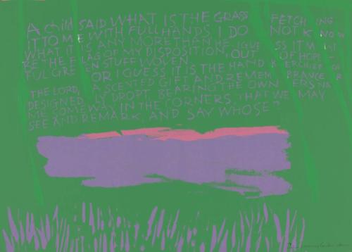Kent’s imagery, ideas, and phrases express her spirituality and appreciation of our world. This work quotes a poem by Walt Whitman, which celebrates the cycle of life and death, while affirming belief in an afterlife.