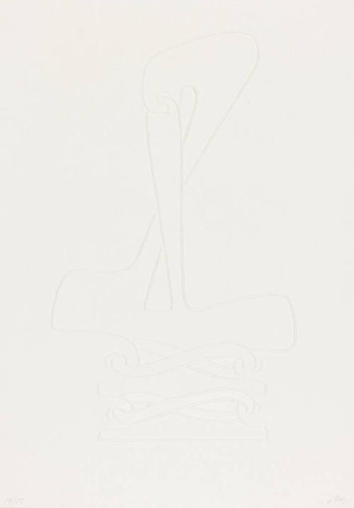 "Drawn to Abstraction," Bedford Gallery, Walnut Creek, CA (Sept 28-Dec 15, 2024).Label TextThe focus of Sorel Etrog’s work is the tension in contemporary living. He describes his art as “tension created by pulling together and pulling apart, with being stuck and being freed, a world of grabbing and holding on and losing hold…bringing shapes together but at the same time giving each independence.” Working in two dimensions instead of his more usual sculptural medium, Etrog is able to create in this print an impossible form, a visual paradox. Form and empty space reverse as the outlines of linked, hammer-like forms at the top defy logic and define only empty space, laced closed, at the bottom.