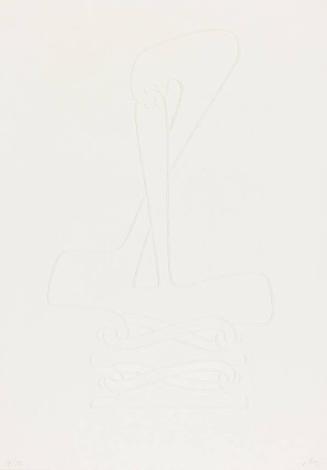 "Drawn to Abstraction," Bedford Gallery, Walnut Creek, CA (Sept 28-Dec 15, 2024).Label TextThe focus of Sorel Etrog’s work is the tension in contemporary living. He describes his art as “tension created by pulling together and pulling apart, with being stuck and being freed, a world of grabbing and holding on and losing hold…bringing shapes together but at the same time giving each independence.” Working in two dimensions instead of his more usual sculptural medium, Etrog is able to create in this print an impossible form, a visual paradox. Form and empty space reverse as the outlines of linked, hammer-like forms at the top defy logic and define only empty space, laced closed, at the bottom.