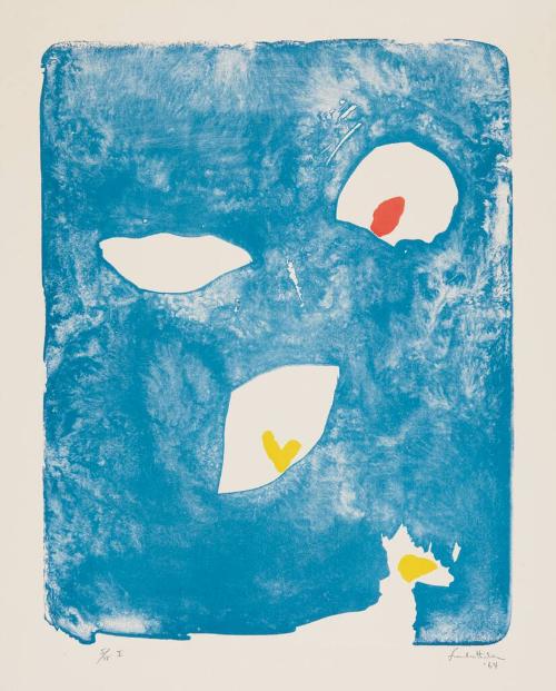 "Drawn to Abstraction," Bedford Gallery, Walnut Creek, CA (Sept 28-Dec 15, 2024).Label TextPrimarily a painter, Helen Frankenthaler poured color over unprimed canvas, allowing it to soak into the flesh of the canvas. Known as an Abstract Expressionist, her dynamic gestures, bold application of color, and spontaneous processes make the paint itself the subject of the work. Frankenthaler’s stains feel weightless, drawing depth into her compositions. In Solarium her celestial swath of blue is, ironically, anchored by the unprinted white of the paper. Frankenthaler pioneered painters’ experimentation with printmaking, which became quite popular with many other painters.