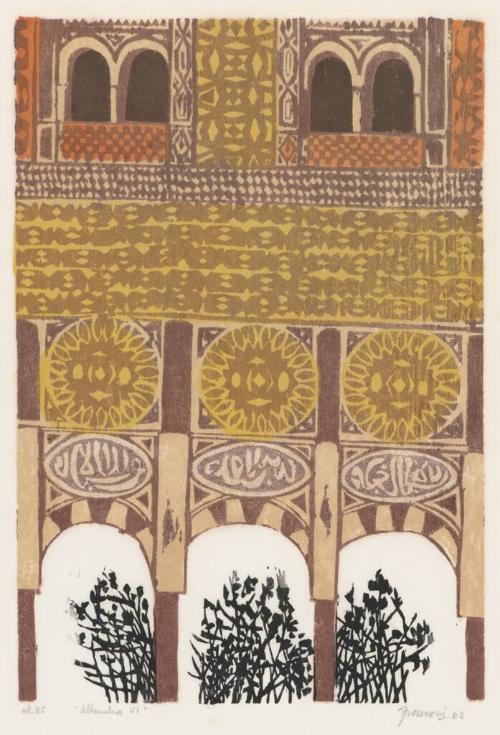Label TextAntonio Frasconi presents a façade of the famous palace of the Alhambra in Spain. To create this image, the artist carved into a wood block the patterning that suggests the ornate tiling of Moorish architecture in the 13th and 14th centuries. Printed patches of bold color accentuate the decorative aspect of the architecture. Frasconi is recognized for his woodcut illustrations of nearly seventy books.