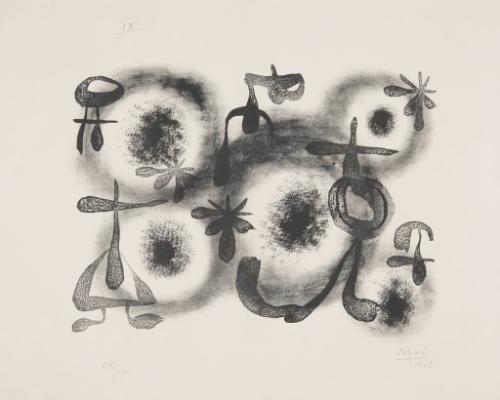 "Drawn to Abstraction," Bedford Gallery, Walnut Creek, CA (Sept 28-Dec 15, 2024).Label TextJoan Miró strips this print of color, emphasizing the playful quality of line identifiable throughout his work. The imagery is certainly abstract, yet the calligraphic marks in the foreground dare to be read as imagined Chinese characters or impish figures. A cluster of circular forms in the background are distinguished not by color but by their regular shape and soft-edged texture.