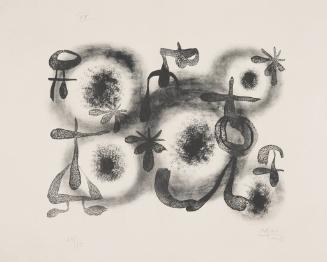 "Drawn to Abstraction," Bedford Gallery, Walnut Creek, CA (Sept 28-Dec 15, 2024).Label TextJoan Miró strips this print of color, emphasizing the playful quality of line identifiable throughout his work. The imagery is certainly abstract, yet the calligraphic marks in the foreground dare to be read as imagined Chinese characters or impish figures. A cluster of circular forms in the background are distinguished not by color but by their regular shape and soft-edged texture.