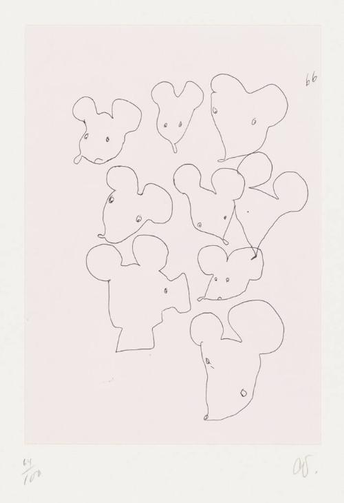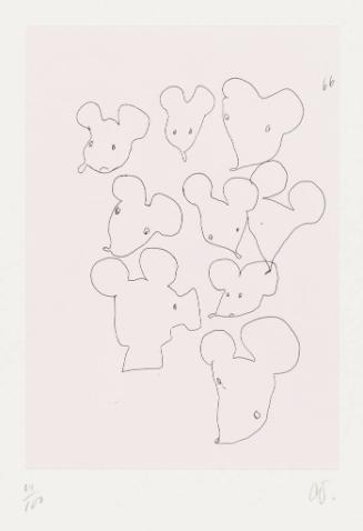 Label TextClaes Oldenburg’s focus on household objects and icons of American popular culture, such as Mickey Mouse, allies him with the Pop Art movement. Oldenburg is widely recognized today for humorously re-imagining commonplace objects as sculptures of monumental size and in unconventional colors and materials. Plate 22 offers a glimpse of Oldenburg at work, toying with a form’s conventional shape, and even accentuating the famous mouse’s cartoonish charm.
