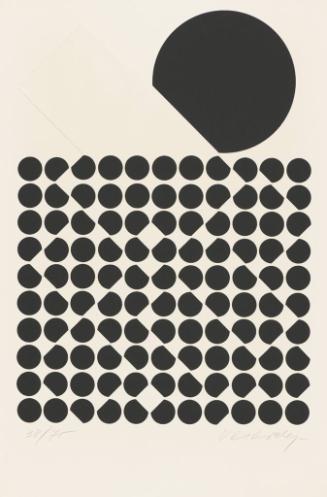 Plate III presents a partial circle as a minimal unit that builds complexity when repeated in multiple orientations. Color is also reduced to the binary distinction of black and white, but can express limitless patterns. This print was completed at the end of Vasarely’s “black and white” period, when he developed the foundations of what would be called Optical (Op) Art.