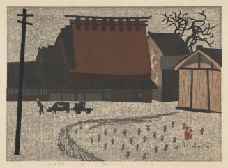Exhibition History"Impressions: Printmaking in Japan," Kalamazoo Institute of Arts Joy Light Gallery of Asian Art (Apr. 1 - July 23, 2017).Label TextThis image pictures a traditional, thatched, country farmhouse. A farmer leads an ox pulling a cart. The curved grey line represents a slightly raised berm surrounding the rice field’s stubbled stalks in winter.