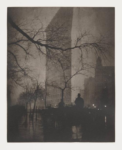 Label TextSteichen’s Flatiron is renowned as an iconic image of New York City at a moment when it was changing in character and beginning to reach new prominence on the global stage. The newly erected Flatiron Building was a symbol of these changes, which included a growing number of skyscrapers, including, even, this triangular building filling a wedge-shaped slice of land between three Manhattan streets - a structure so tall that it couldn’t be contained within Steichen’s camera frame. Though mocked by some for its unconventional shape when it was built, the building has since become a landmark contribution to early twentieth century American architecture and a prominent symbol of the city in which it sits.