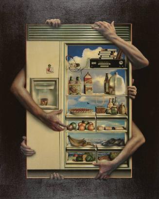 "2024 West Michigan Area Show - Celebration of Purchase Prize winners in honor of KIA's 100th Anniversary," KIA Gallery 4 (May 3 - August 18, 2024)Label Text"In this painting, Kalamazoo artist Doug Dykehouse has filled a refrigerator with not only food and drink but also technology and VHS tapes, jewelry, and shoes. Multiple sets of arms grasp from the void behind, desperately clinging to the appliance—filled with sustenance and status symbols—which opens up to a vast seascape.