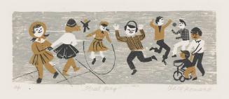 Exhibition History"Copley to Kentridge: What's New in the Collection?," KIA (Sept.14 - Dec. 1, 2013). "Passion on Paper: Masterly Prints from the KIA Collection," March 17 - July 15, 2018, Groos Gallery. "What Is Going On In This Picture?" KIA Upjohn Mason Grandchildren Interactive Gallery (Sept. 10, 2022 - Feb. 26, 2023).Label Text"Gift of Zoe and Harold Schuitmaker in honor of Darlene Pontello Warren's retirement, 2011.104 Romano created this woodcut when she and her husband, John Ross, partnered to illustrate a book, Manhattan Island, by May Garelick. Romano’s joyous depiction of children playing together in a variety of games captures the exuberance of Garelick’s text. This is a good print for study to appreciate the dynamics of classic, multiple color printing. Viewers can easily dissect the image into its three color components and imagine the carving required for each of those separate blocks. A particularly nice touch in the crafting of this composition was the unifying effect that resulted from using the wood grain of the gray block as the background element (written by Nancy Sojka for Passion on Paper: Masterly Prints from the KIA Collection, 2018)."