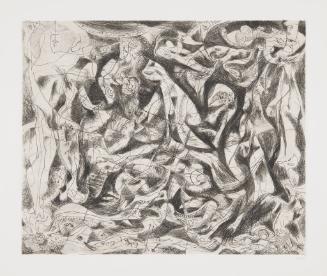 "Lasting Legacy: A Collection for Kalamazoo," Kalamazoo Institute of Arts, Kalamazoo, Michigan (Sep. 6, 2014 - Jan. 4, 2015).Label TextAt the same time he was breaking new ground with his “drip” paintings, Jackson Pollock briefly explored the centuries-old medium of metal plate engraving. In this print, Pollock carved a pattern of animated lines into the metal plate. By varying the pressure and direction of the engraving burin, each line acquired its own distinct character. Pollock further developed the image by creating dark, tonal areas through the drypoint technique (scratching the plate with a finely pointed tool). The soft, blurry effect of the drypoint areas contrasts with the sharper and darker engraved lines. Despite working on a small scale in an unfamiliar medium, Pollock was able to create the same restless, undulating forms in print that he achieved in painting.