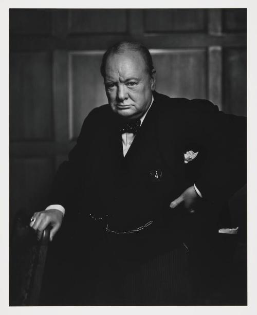 Exhibition History"Copley to Kentridge: What's New in the Collection?," KIA (Sept.14 - Dec. 1, 2013). "Lasting Legacy: A Collection for Kalamazoo," Kalamazoo Institute of Arts, Kalamazoo, Michigan (Sep. 6, 2014 - Jan. 4, 2015).Label TextIn 1941, the Prime Minister, Mackenzie King, invited me to be present while Churchill addressed the Canadian Parliament….After the electrifying speech, I waited in the Speaker’s Chamber where I had set up my lights and camera. I switched on my floodlights; a surprised Churchill growled, “What’s this, what’s this?” I timorously stepped forward and said, “Sir, I hope I will be fortunate enough to make a portrait worthy of this historic occasion.” Churchill lit a fresh cigar, puffed at it with a mischievous air, and then magnanimously relented. Churchill’s cigar was ever present. I held out an ashtray, but he would not dispose of it. I went back to my camera and waited; he continued to chomp vigorously at his cigar. Then I said “Forgive me, sir,” and plucked the cigar out of his mouth. By the time I got back to my camera, he looked so belligerent he could have devoured me. It was at that instant that I took the photograph. The silence was deafening. Then, smiling benignly, he shook my hand, and said, “You can even make a roaring lion stand still to be photographed.” Yousuf Karsh