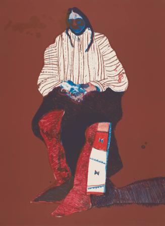 Label TextBorn in Breckenridge, Minnesota in 1937, Fritz Scholder was an artist who initially eschewed painting the Native American experience. An early student of Oscar Howe, a notable artist of Yanktonai Dakota descent, Scholder then went on to study with Wayne Thiebaud at Sacramento State University. Other artists such as Francis Bacon, Leonard Baskin, and Willem de Kooning influenced Scholder’s artistic practice. It was not until he began teaching at the Institute of American Indian Arts (IAIA) in 1964 that Scholder created his first paintings of Native Americans in response to the lack of representation of contemporary Native American lifestyles. Scholder’s dynamic compositions featuring bold colors and expressive brushwork that blended figurative, abstraction, and Pop Art brought him mainstream recognition. By 1969, the artist left the IAIA to pursue a full-time career as an artist. At that time, he expanded his practice to include photography, printmaking, and sculpture. A 1970 invitation to the Tamarind Institute printshop introduced him to printmaking and resulted in a 14-year partnership. Indian with beaded sash is one of those series of prints created during his years working with Tamarind. Portraits like this were controversial within and outside the Native American community, with some seeing his depictions of Native peoples as reifying European and American ideals of Native American life. Regardless, Scholder's paintings subverted Native American stereotypes such as “the noble savage,” and instead shed light on the lasting traumas and daily realities affecting Native Americans such as alcoholism, displacement, and unemployment. As he was one-fourth Luiseno and German, Scholder did not consider himself “fully Native.” Scholder created images that critiqued Western and non-Native ideas of Native Americans. He embraced the paradox of emotions his works instilled and saw them as a way to draw people in. An irony especially, in light of this depiction of his Indian with beaded sash, which at first glance could be perceived as a stereotype of an Indian persona. However, portraits like these are larger-than-life representations of Native people; perhaps, alluding to society’s inability to comprehend and appreciate Native American contributions and experiences fully. Although Scholder received wide national acclaim, he did not want to be considered a proponent of the New American Indian Art Movement. Nonetheless, Scholder influenced generations of young Native American artists. In 1980, Scholder stopped painting Native American portraits and life, instead focusing on depicting his travels and other interests such as mythology, death, and the afterlife until he died in 2008.There are no works to discover for this record.