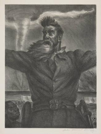 Exhibition History"Lasting Legacy: A Collection for Kalamazoo," Kalamazoo Institute of Arts, Kalamazoo, Michigan (Sep. 6, 2014 - Jan. 4, 2015).Label TextWith flaring eyes and wind-whipped beard, John Steuart Curry’s vision of John Brown radiates moral outrage. Violently opposed to slavery, Brown clutches a Bible in one outstretched arm and a rifle in the other. A slave gazes up at the raging abolitionist. A wagon-line of settlers enters Kansas, a sunflower-dotted territory that promises both fertile land and devastating hardships. Looming behind John Brown, the tornado and prairie fire symbolize the gathering storms of a war over slavery.