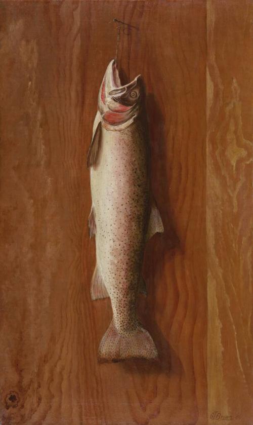 Grafton Tyler Brown’s more spare approach directs attention to the trout’s rose blush, spotted skin, and delicately fanning fins. Against the painted wood-grain background, Brown’s trout is not presented as a trophy of the fisherman’s prowess or even of the trompe-l’oeil painter’s virtuosity, but as a native creature of the American wilderness. The carefully rendered trout becomes an icon, presented for contemplation.