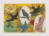 While many prints may appear two-dimensional and graphic, Akers works to create depth by densely layering his relatively small prints. He uses found images to create intricate cut-out collages that are turned into monoprints, and Race for Place II consists of three layers of imagery. The back-most layer depicts a clash between Native Americans and settlers. On the left-hand side, Native Americans commandeering birch bark or dugout canoes make landfall in a wooded area. In the center of the image, Native Americans, armed with bows and arrows, battle ax-wielding settlers. Dying or wounded bodies are strewn throughout the scene. The battle continues to the upper right corner. The next layer depicts two hands, palms facing outward toward viewers. A web of string is intertwined between the thumb and forefinger on each hand, reminiscent of cat’s cradle—a game ubiquitous in cultures around the world for hundreds of years. Finally, the work is layered with images of birds, UFOs, and a Lakota Sioux man. The latter image was found in an old Merriam-Webster dictionary as the illustration for tom-tom. George Washington and Abraham Lincoln hover above the scene in flying saucers, looking for a place to land. Akers borrows these two portraits from the ones used on U.S. currency. The birds in this work, like the silhouette of the scissor-tailed flycatcher on the left-hand side, symbolize migration.