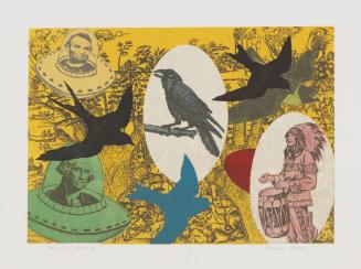Label TextA member of the indigenous Osage Nation, Norman Akers creates colorful monoprints that often layer contemporary and pop culture imagery alongside references to his cultural heritage. For years, Akers alternated between painting and printmaking. However 15 years ago, printmaking became his preferred medium, whereas before it served as a way to make preliminary studies for his finished paintings. Akers notes that his training as a painter still comes through in his works. The prints juxtapose very flat elements with an illusion of space influenced by the canon of Western art traditions.