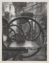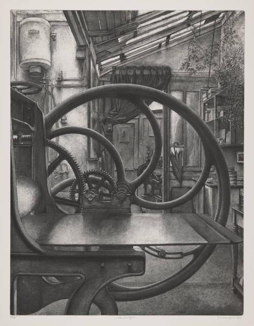 Atelier René Tazé IV is one in a series of meticulously observed views of a Parisian studio belonging to master printer René Tazé. In a long association with Desmazières, Tazé has printed over 200 of the artist’s plates in his studio. Desmazières is captivated by Tazé’s printing press: the beauty of its arcs and angles, cogs and gears, reflections and shadows. Between the crescent spokes of the wheel, we glimpse commonplace details of the studio space, including a water heater and pipes, an umbrella hooked on a window, tangled vines, a broom propping open a skylight, and a heavy curtain pulled aside to reveal more serpentine iron machinery and rectangular doors. In the graceful repetition of curves and circles overlaying the angular architecture of the studio walls, Desmazières finds a joy in the geometry of this humble space.There are no works to discover for this record.
