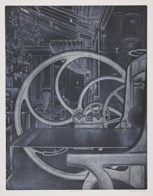Label TextAtelier René Tazé V is one in a series of meticulously observed views of a Parisian studio belonging to master printer René Tazé. This print (V) might appear to be a mechanically produced negative image of another in the series, Atelier René Tazé IV (also in the collection of the Kalamazoo Institute of Arts). However, careful comparison reveals small differences that confirm the prints were pulled from unique plates. Reportedly, the artist was so taken with the reversed, negative image that appeared on the plate during the preparation of version IV, he determined to reproduce the strange, dark vision as a finished print. The result is a magical, “through the looking-glass” interpretation of reality, a place that is both familiar and surreal.There are no works to discover for this record.