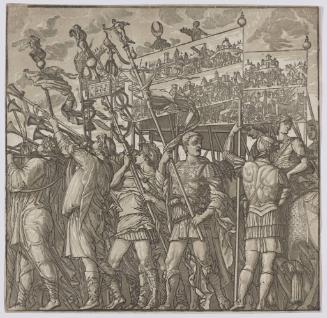 Exhibition History"The Way Forward: New Acquisitions at the KIA," July 28 - December 2, 2018.Label TextThis print is part of a series entitled, Triumphs of Caesar, which was originally painted as large murals by Andrea Mantegna for the Gonzaga family’s Palazzo Ducale di Mantova in the late 1400s. Later, the murals were copied in a series of grisaille (grey) paintings by Francesco Malpizzi and in 1599 Andrea Andreani created a set of chiaroscuro woodcuts from the grisaille paintings.