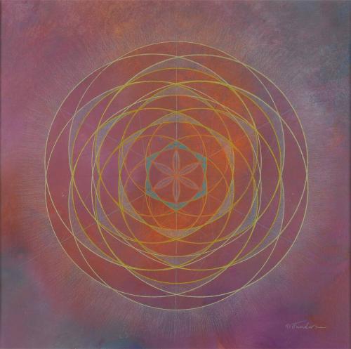 "Resilience: African American Artists as Agents of Change," [Travel Version] at the Dennos Museum Center, Traverse City, MI (June 6, 2021 - August, 15, 2021)Label TextGateway to Memory is a prime example of Vandorn Hinnant’s ongoing exploration of the mathematical and scientific study of the universe. Based on the golden ratio, Hinnant has grounded his compositions in sculpture, drawing, and mixed-media paper works on an awareness of universal order. He says his forms are “a reflection of the geometries of nature and embody some of the energetic matrices of Nature’s pre-material templates.” They are a direct connection between the arts and sciences. Gateway to Memory has a delicate surface that is layered with subtle color shifts and intricate marks that indicate an energy that magnifies the human experience in relationship to the cosmos. When two or more circles share a radius they become the foundation for all of Hinnant’s artworks. “I see the circle as a symbolic representation of the human soul—the soul’s origins,” he says. The fine lines produced by the tracing of concentric circles with Prismacolor pencils and acrylic paint actually produce delicate layers of surface textures in very fine, minute detail. But it’s the mapping of the space by the overlapping of circular patterns that brings energetic life to the composition. Gateway literally radiates from the center in a colored burst resembling the visual scene of a star being born. The multi-layered symmetrical mandala grows from an ancient Tibetan tradition of creating physical patterns to represent sound—known from ancient times to be, along with light, one of the dual aspects of creation. As Hinnant states, “The harmonic spatial frequencies embedded in my work reminds me of a quality of being that is attainable by all. This geometry has the potential to activate our often dormant awareness of universal order, and the love, beauty, and grace of the soul.” [Collection Highlight]