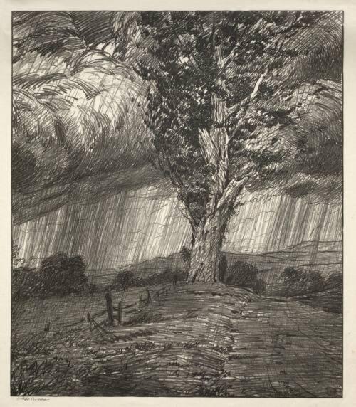 Many of Brown’s lithograph landscapes are tonalist in nature having contemplative and atmospheric qualities. He freed himself from creating strictly realistic images. His images, while sourced from nature, were heavily influenced by mood and imagination. In Storm, Brown uses his approach to tonalism to create a scene in which no one element dominates another. The rain becomes grass and the tree becomes the sky.
