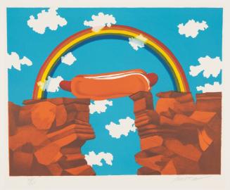 Label Text"What does Hot Dog Bridge, a seemingly whimsical work, try to convey to the viewer? Is it a gentle ribbing towards the art world, which, at times, can be all too serious? Is it a commentary on the American experience? After all, what’s more American than a hotdog? Or does the rainbow spanning a Southwest landscape symbolize hope and unity?