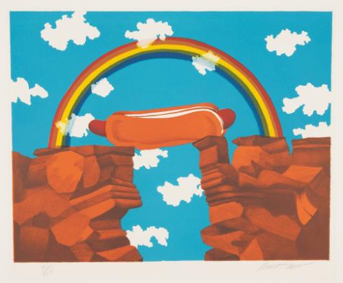 Label Text"What does Hot Dog Bridge, a seemingly whimsical work, try to convey to the viewer? Is it a gentle ribbing towards the art world, which, at times, can be all too serious? Is it a commentary on the American experience? After all, what’s more American than a hotdog? Or does the rainbow spanning a Southwest landscape symbolize hope and unity?